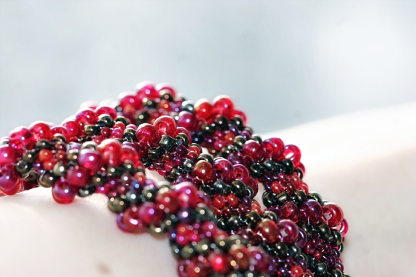Материалы: бисер – самодельный микс из чешского красного бисера, серебристый бисер, матовый бисер сиреневых оттенков, бусины красные и черные, джинсовая ткань, мононить, ювелирная проволока, фурнитура.