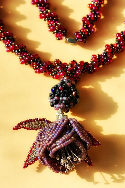 Техники: ткачество, счетный пейот, восьмерка-мозаика, обычная низка. Для цветка – французская техника.