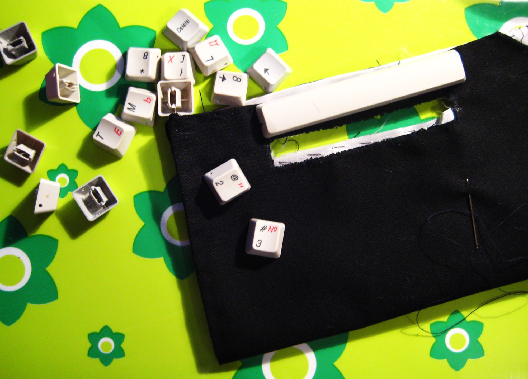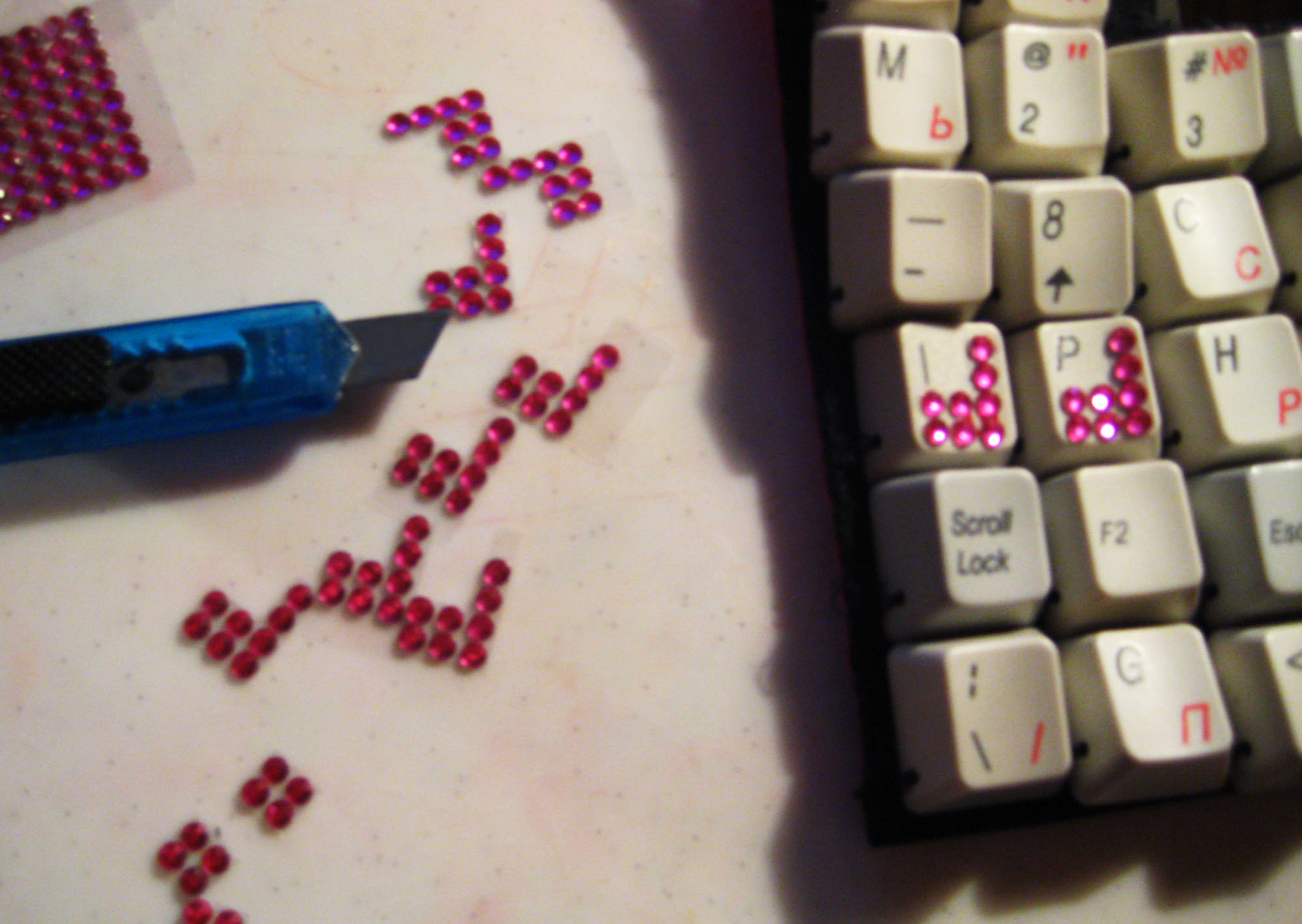 Для начала нужно было подготовить клавиши, т.к. практичнее пришивать, а не приклеивать! Так что 56 качественно просверленных клавиш легло на черное полотно, и в завершение ко всему было украшено стразами!
