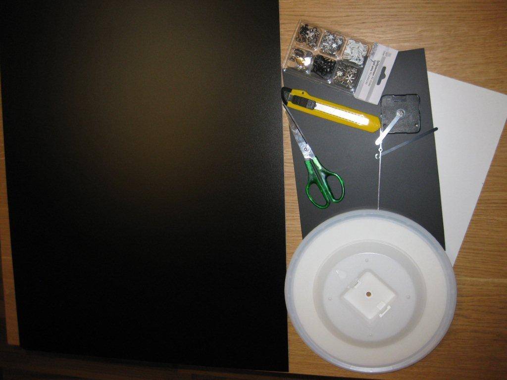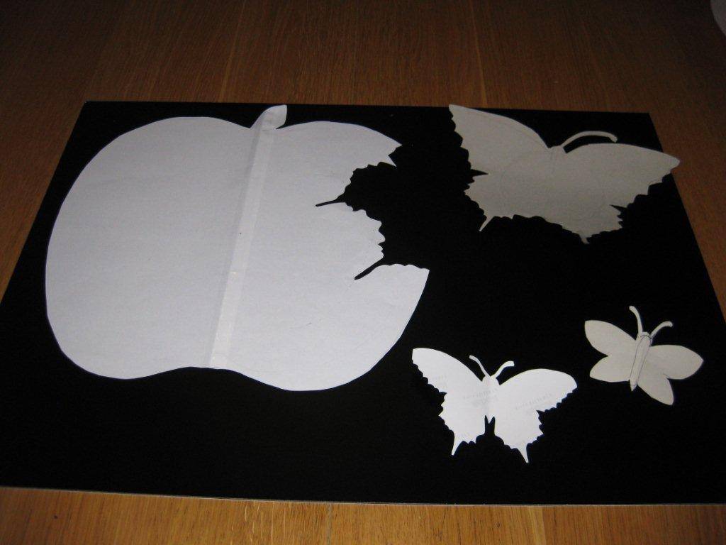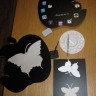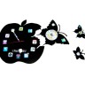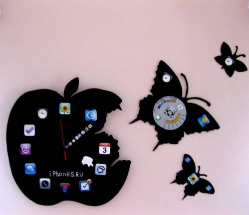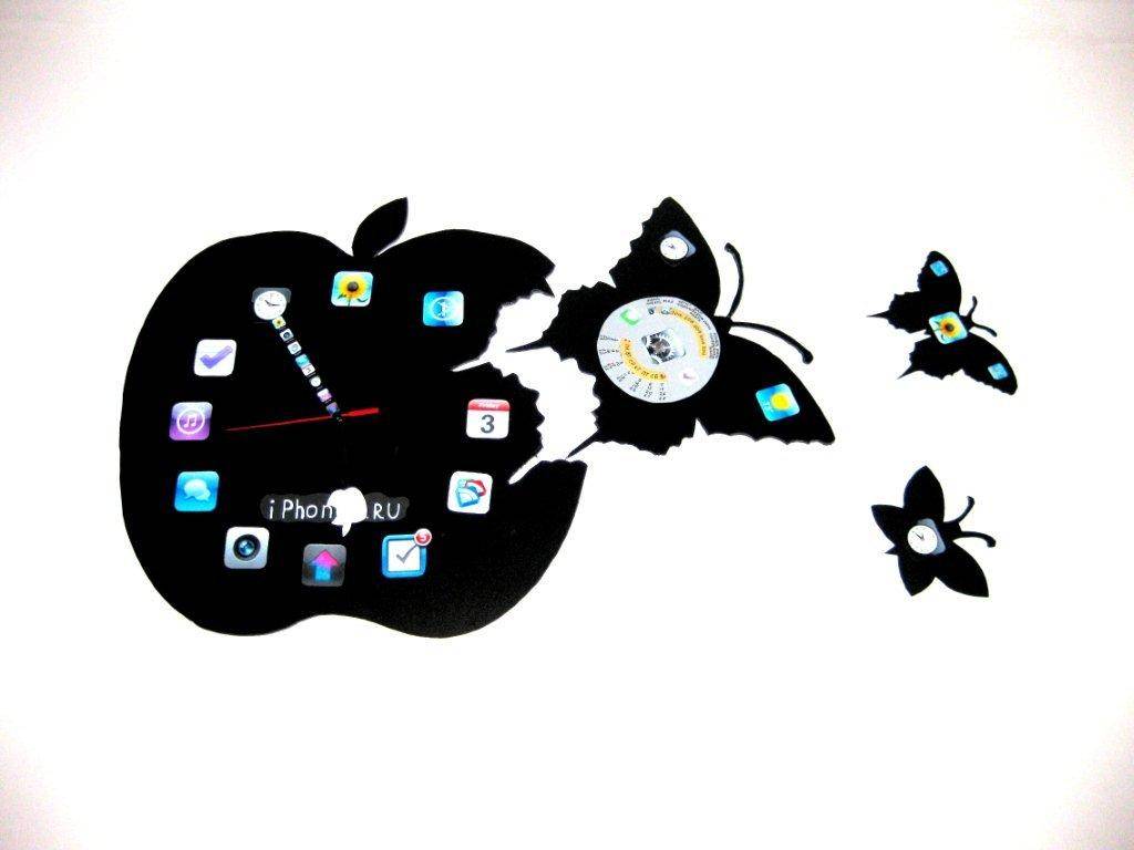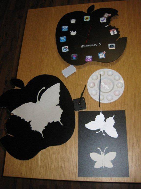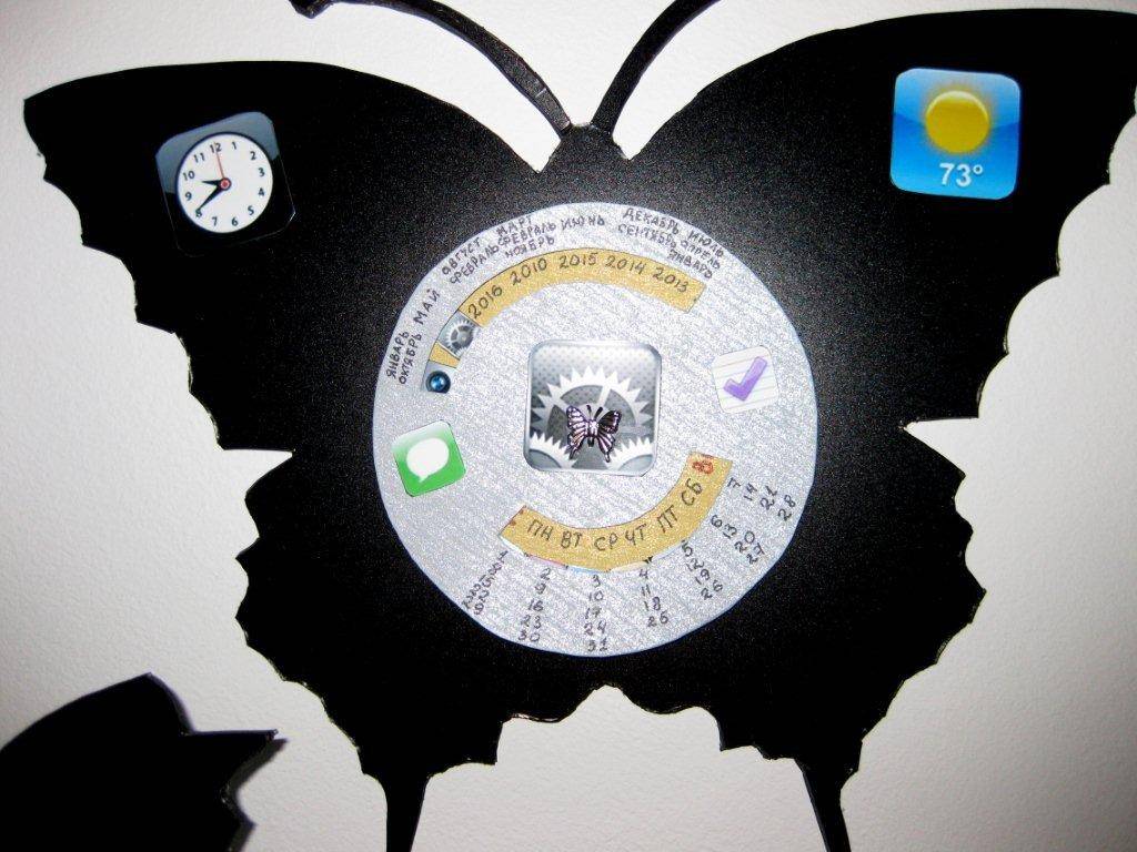 ’’ использовался черный пластик краски, фото иконки, серебристая и золотая бумага и моя фантазия. В изготовленный макет я встроила часовой механизм. Белое яблочко служит часовой стрелкой, ряд из иконок минутной. На самой крупной бабочке, которая первой покинула яблоко и послужили разносчиком времени, я поместила круглый календарь до 2016 года.