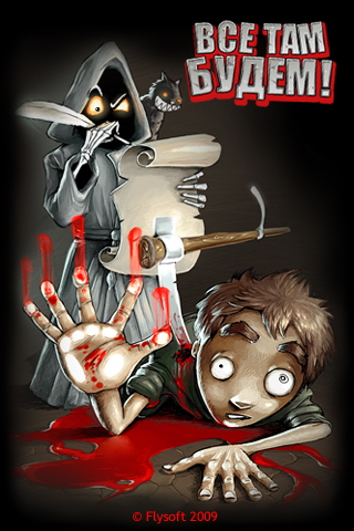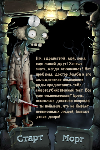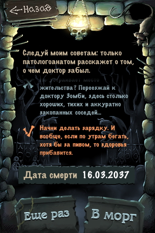 Доктор Зомби или «Все там будем!». На самом деле Доктор Зомби – это всем знакомый доктор Хаус после смерти. Злобный, циничный, с чувством юмора, режет правду-матку, стебется над всеми подряд и работает зав. кладбищем. Зловещий дизайн, гробики, могильные мотивы и таинственная серость подчеркивают идею приложения. После ответов на вопросы доктора вы узнаете, сколько вам осталось жить с точностью до секунд и, собственно, когда подруга с косой вас настигнет. Несмотря на несерьезность, вопросы и результаты теста адекватны действительности. Другими словами, прикол приколом, а к советам Доктора Зомби о том, как пожить подольше, прислушаться стоит. За время создания теста были перекопаны тонны черного юмора, отобраны и приспособлены десятки известных цитат и афоризмов. Так что люди подготовленные найдут там много чего интересного.