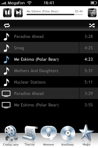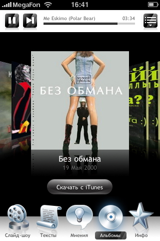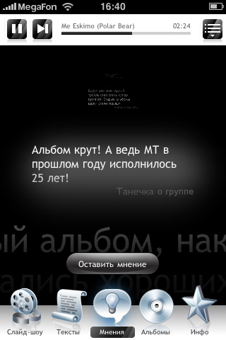 Отдельного упоминания заслуживает очередной косяк цензоров Apple, проявившийся при рассмотрении приложения. Программа была одобрена в рекордные (для наших продуктов) 3 дня! И это при том, что альбом содержал скандальный клип Медведица, в котором полностью была раскрыта тема сисек и не только.