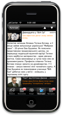 UI интерфейс приложения основан на UITabBar и UITableView компонентах. Как уже упоминалось выше, новости разбиты по группам на UITabBar-е. Каждая вкладка содержит список новостей с иллюстрацией, заголовком и коротким описанием. Весь список можно скролить.