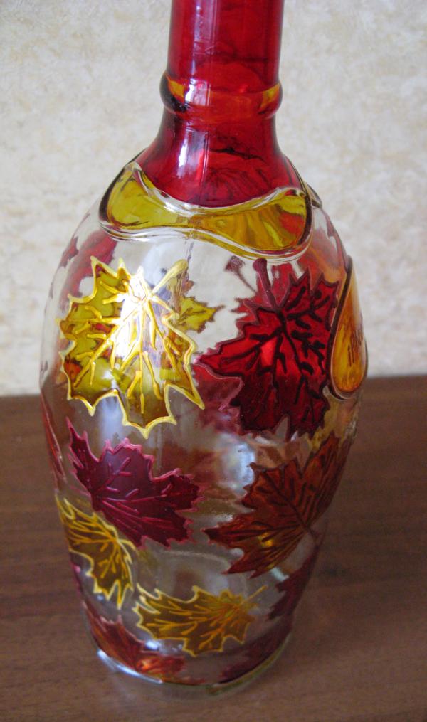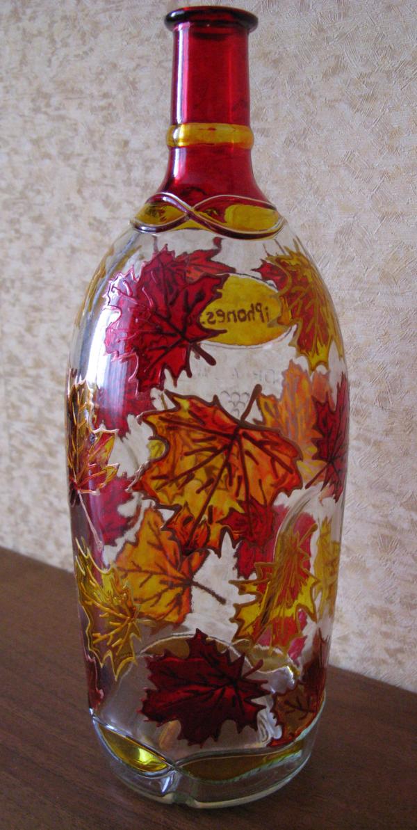 Вот интересно, а что вы делаете со вторсырьём? Выкидываете? А я вот использую его как холст для своих работ! Так что не только Apple старается делать свою продукцию экологически чистой ; ) . Эта бутылка из-под великолепного вина в течении пяти дней покрывалась контурами и красками и… о, чудо! Теперь на ней можно лицезреть листопад далёкой осени. Да, я люблю осень.