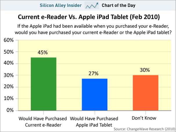 iPad не успел ещё выйти, а его уже хотят. Собственно, ничего удивительного. Люди частенько хотят то, что делает обыкновенно Apple. Другие их за это, бывает, недолюбливают, но первые просто ничего с собой сделать не могут, и плевать им на условности. Взять хотя бы очередной опрос Silicon Alley Insider, в ходе которого выяснилось, что 27% самых настоящих владельцев читалок на электронной бумаге не купили бы этот ненавистный теперь монохромный прибор, если б на момент приобретения уже был доступен iPad: