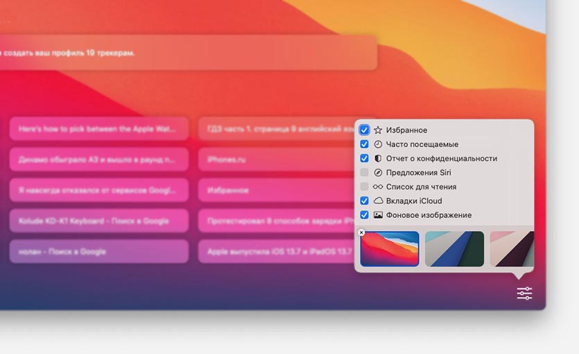 В Big Sur добавили кастомизацию стартового экрана. В настройках можно изменить фоновое изображение, включить отображение вкладок iCloud, списка для чтений и предложений Siri.