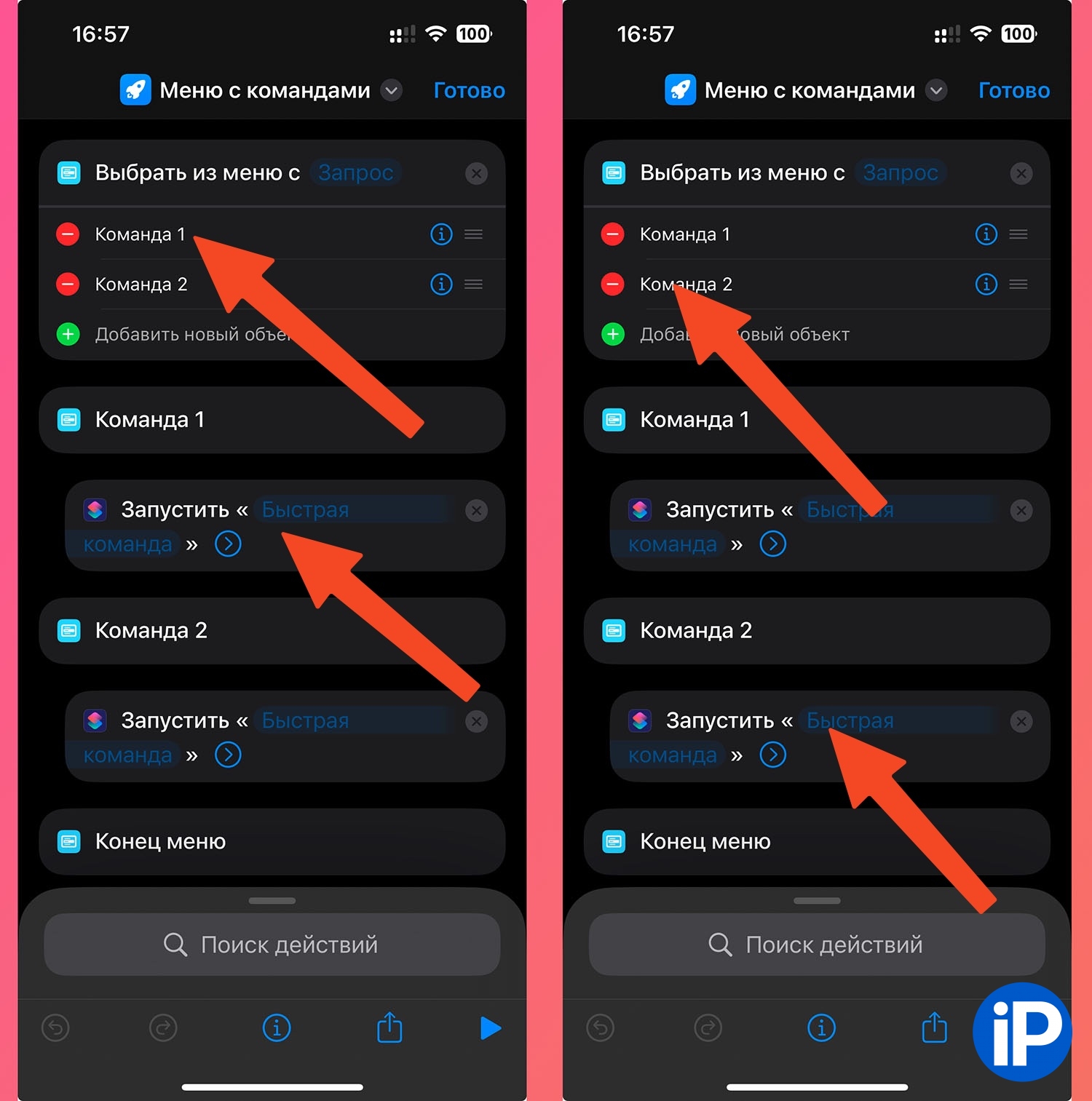 ▶ В настройках команды поменяйте три действия на нужные вам. Можно сразу выполнить нужное действие, запустить готовую автоматизацию или любое приложение на устройстве.