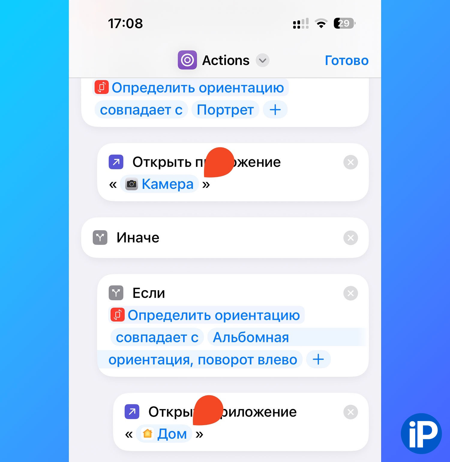 ▶ В настройках команды выберите нужные действия для каждого положения смартфона. Например, в портретной ориентации запускать мессенджер, в ландшафтной камеру и так далее. Можно выбрать 6 действий на каждое доступное положение гаджета.