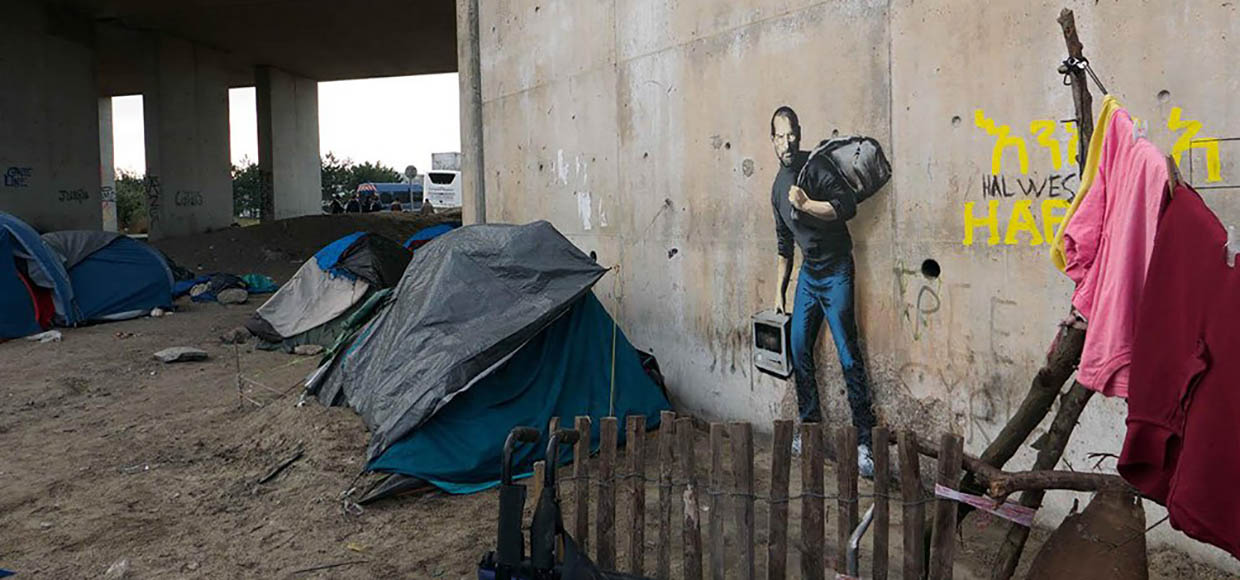 Британский политический активист и уличный художник, известный под псевдонимом Бэнкси, разрисовал опору моста возле крупного лагеря беженцев на севере Франции. На граффити изображен Стив Джобс с мешком пожитков за спиной и старым компьютером Apple в руке.