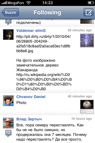 Теперь непосредственно о Buzzie. Обладает всеми стандартными функциями. Можно посмотреть посты ваших фоловеров. Рядом с каждым постом отмечено сколько к нему комментариев. Просмотр прикрепленных фотографий работает. А вот видео, пока что, в программу не интегрировано. Можно отдельно открыть свои посты или посмотреть тех, кто находится поблизости. Опять же, идет привязка к вашему местоположению. Не так давно в программе проявилась возможность публиковать фотографии прямо с Вашего iPhone. А главное, в ней уже есть Push. Я думаю, что разработчик будет добавлять и другие вкусности в программу. Ведь Buzz развивается семимильными шагами.