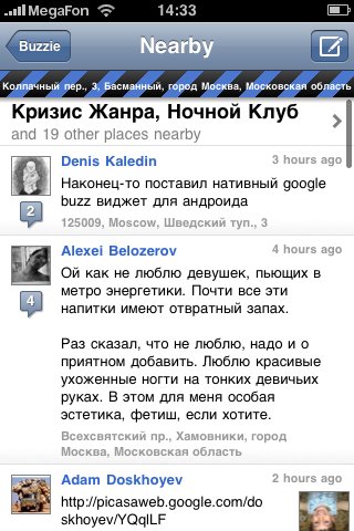 За два месяца существования Buzz, я был очень удивлен, что никто и словом не обмолвился о нем здесь. Ведь во время первого запуска, Google сделали акцент именно на пользователей iPhone, для них Живая лента стала доступна сразу же. Просто открывай Safari, вбивай buzz.google.com логинься и наслаждайся. Buzz сразу же определит ваше местоположение и сделает привязку на карте. Плюс, вы можете увидеть ближайших базовцев, что и кто пишет в округе.