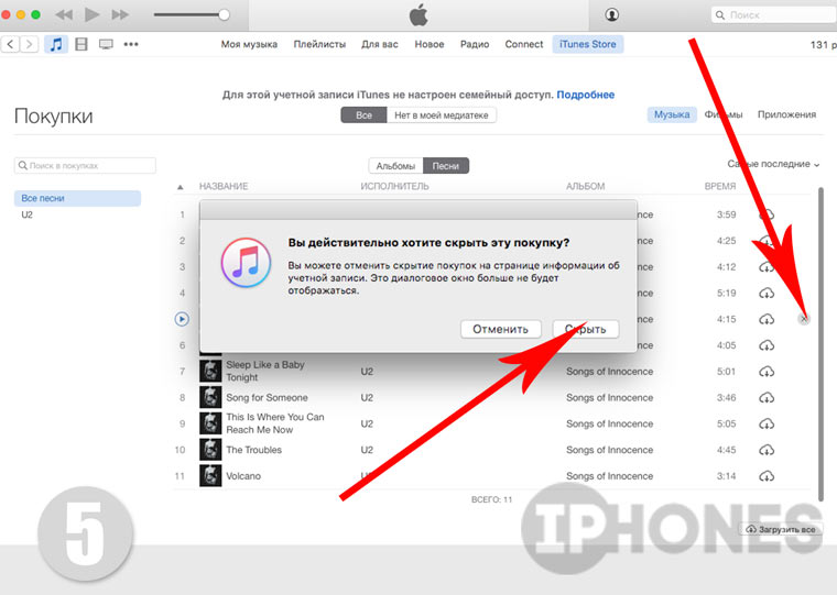 - Для скрытия композиций (откройте отображение Песни), фильмов или приложение достаточно навести курсор и нажать на появившийся крестик. Согласившись с диалоговым окном о намерении скрыть контент, трек, фильм или приложение тут же пропадет из списка.