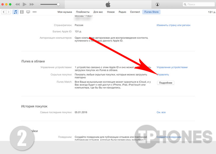 - В категории iTunes в облаке выберите пункт Управлять напротив Скрытые покупки.