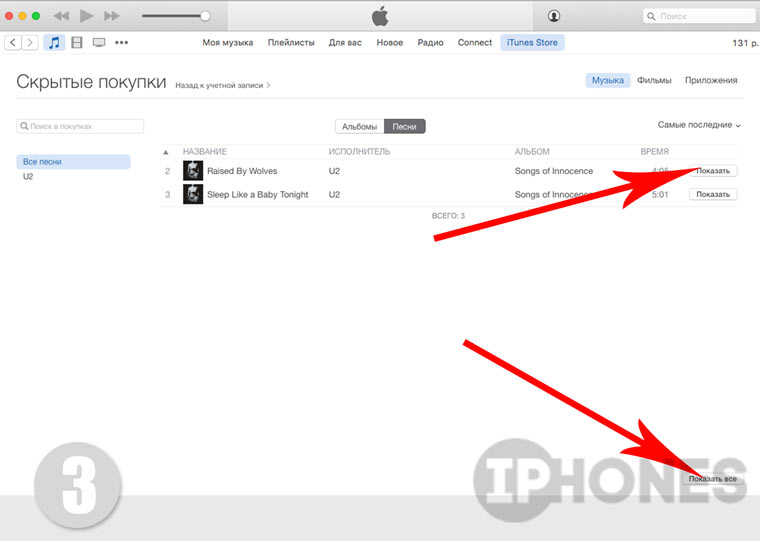- В категориях Музыка, Фильмы, Приложения, в списке скрытого контента, нажмите Показать.