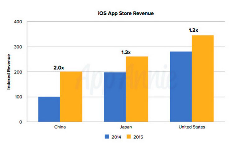 Интересная ситуация складывается и с анализом популярности платформ на разных рынках. У App Annie нет данных по успехам Google Play в Китае, потому что магазин пока не работает в Поднебесной. Прибыли же Apple от китайского App Store выросли вдвое за последний год. Выходит, что китайские потребители в 2015-м активней всех покупали приложения в App Store (больше, чем японцы с их ростом покупок в App Store в 1,3 раза, и больше, чем американцы, с ростом покупок в 1,2 раза). При этом китайский рынок In-App покупок в iOS-приложениях стал первым в мире по прибыльности для Apple (в прошлом по In-App лидировал американский рынок).