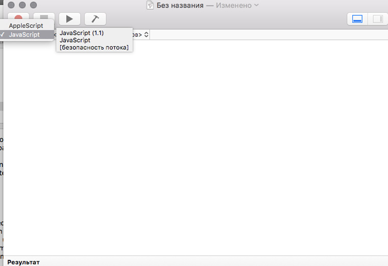 1. Открываем Программы->Утилиты->Редактор скриптов. Выбираем язык JavaScript (по умолчанию выбран Apple Script).