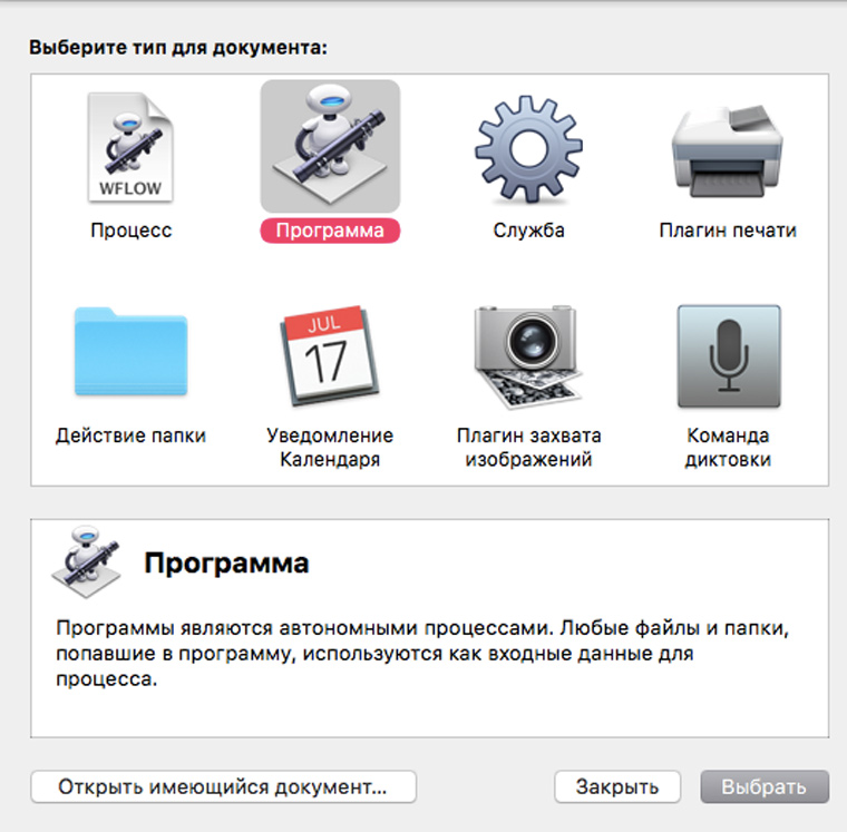 1. Открываем Программы->Automator и выбираем пункт меню Файл->Новый: