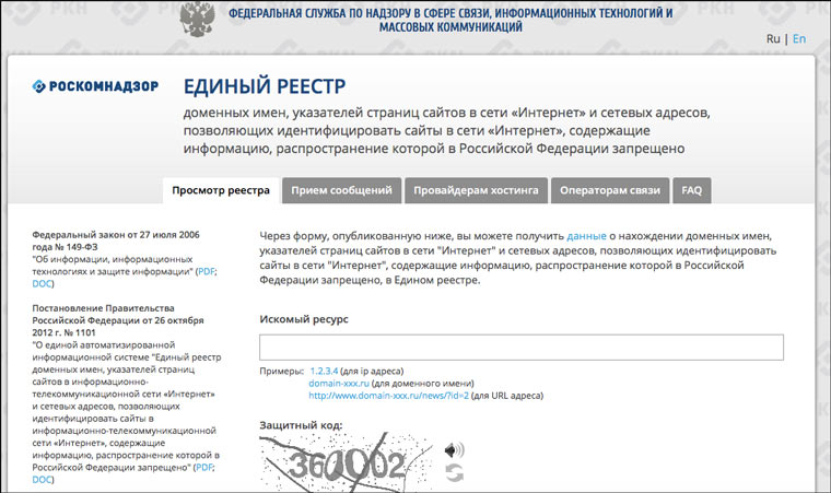 В 2012 году под руководством Роскомнадзора был создан «Единый реестр доменных имён, указателей страниц сайтов в сети «Интернет» и сетевых адресов, позволяющих идентифицировать сайты в сети «Интернет», содержащие информацию, распространение которой в Российской Федерации запрещено».