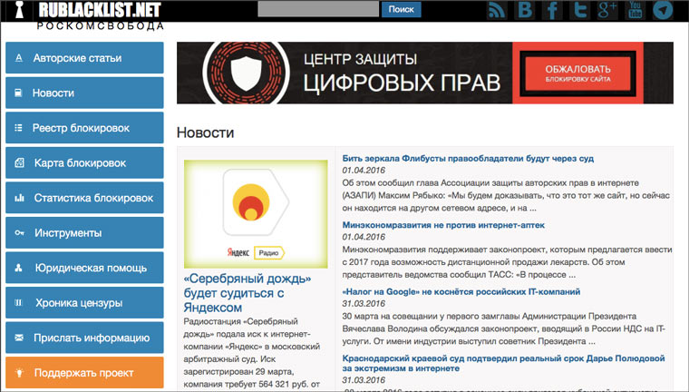 Закон в действии: за экстремистские материалы заблокирован сайт grani.ru, в марте 2015 года временно блокировался сайт kasprarov.ru за публикацию призывов к участию в митингах.