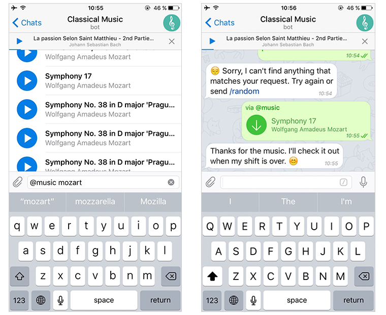 Команда бота @music позволяет искать классическую музыку по имени композитора. Работает по такому же принципу, что и бот YouTube.