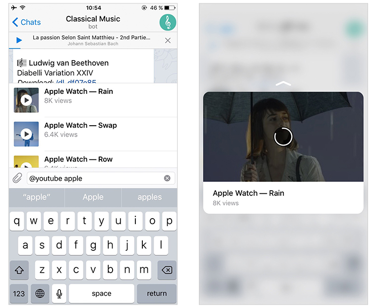 Команда бота @youtube в начале сообщения вызывает поиск роликов на YouTube. Достаточно после команды поставить пробел, написать точное имя видео и выбрать нужное из предложенного списка.