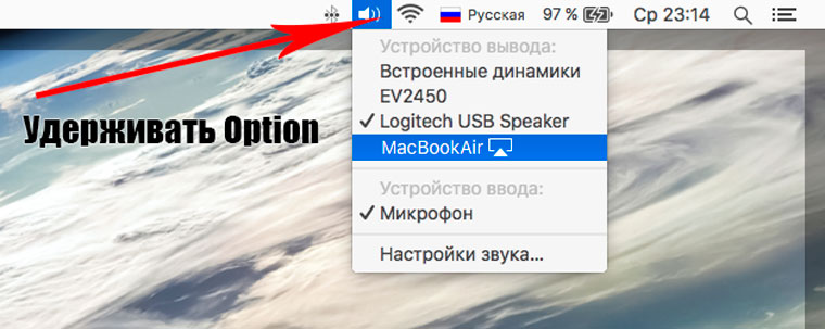 3. Зажми на клавиатуре клавишу Option (Alt) и щелкни по значку громкоговоритель. Откроется меню с выбором звуковых источников выхода. Выбери нужный и музыка начнет играть через него.