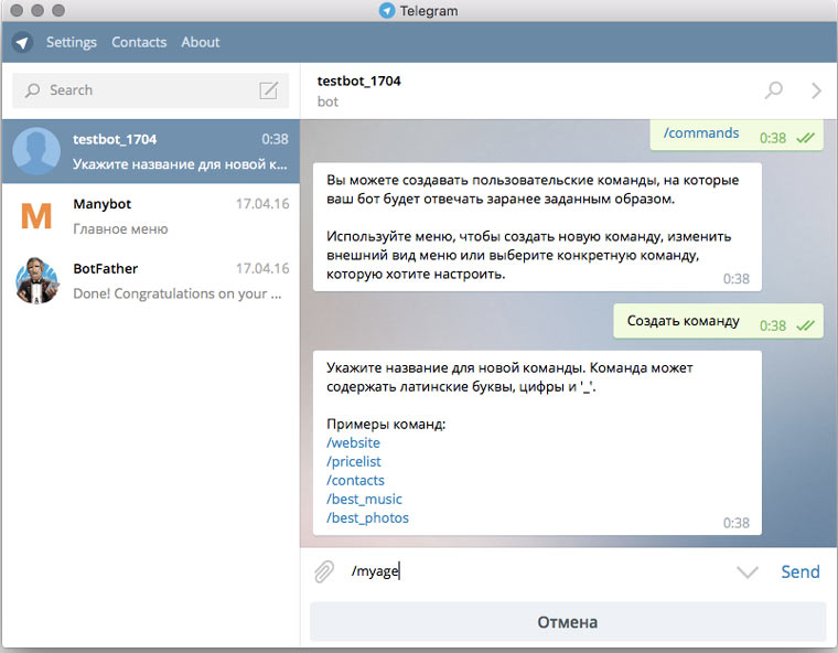 Вот и все, что нужно знать, чтобы создать простейшего бота. Больше информации о функциях, которые может добалять manybot.io можно узнать, если набрать в своем боте команды /help.