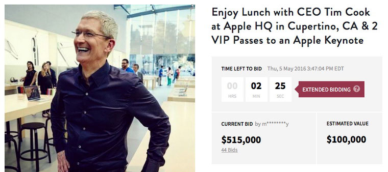 Уже четыре года подряд в Apple проводится благотворительный аукцион CharityBuzz. На кону — обед с Тимом Куком и два VIP-пропуска на одно из официальных мероприятий компании. Вероятней всего — на конференцию WWDC. Личность выигравшего Apple держит в тайне.