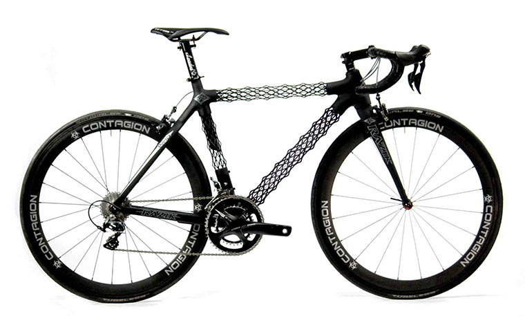 Первое, что привлекает внимание — компонентная рама, сплетенная на первый взгляд из проволоки. По факту же это карбон и углеродные нанотрубки, собранные в хитрую конструкцию — одновременно легкую, жесткую, но способную амортизировать, когда нужно. Можно купить только раму с вилкой и поставить навесное самому, либо заказать в наборе с комплектующими Shimano.