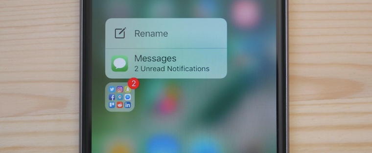 Вызов 3D Touch у папок позволяет переименовать целую категорию, либо просмотреть в каком приложении у вас есть пропущенные уведомления без открытия самой папки.