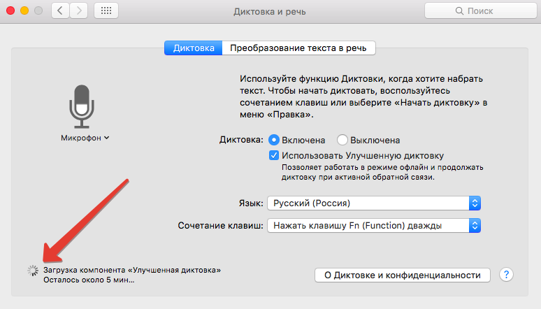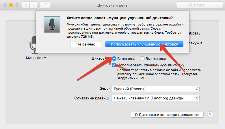 Система предложит загрузить пакет файлов для работы функции Диктовка. Размер русской диктовки составляет 726 МБ. Подтверждаем выбор во всплывающем окне — Использовать Улучшенную диктовку.