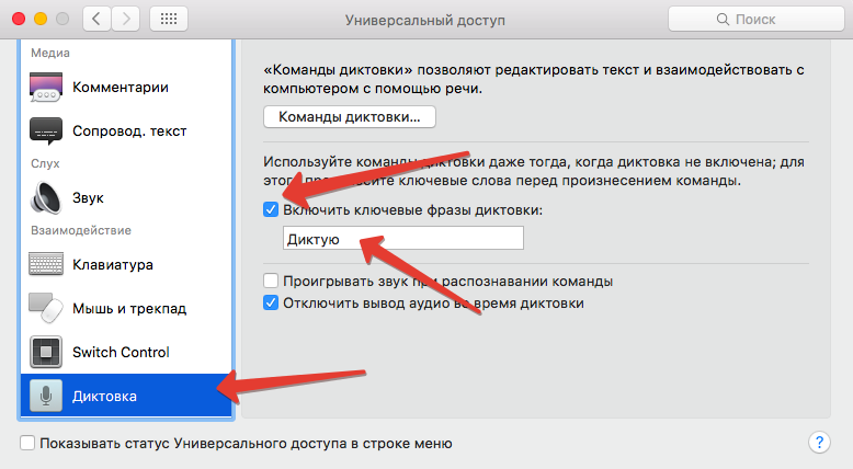 4. Открываем Настройки —> Универсальный доступ и в боковом списке выбираем пункт Диктовка.
