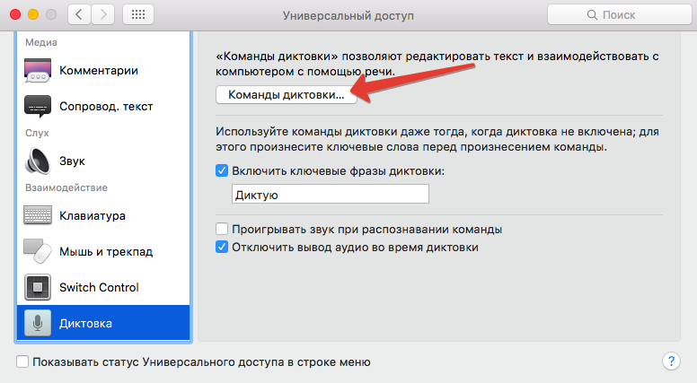 5. С дополнительным списком команд можно ознакомиться в меню Команды диктовки, расположенном в том же разделе Универсального доступа.