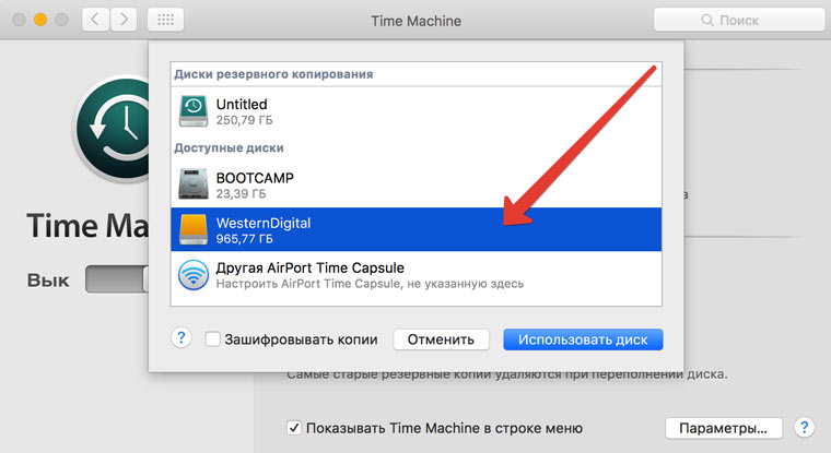 2. Откройте Настройки —> Time Machine и нажмите пункт Выбрать диск. Укажите раздел подключенного жесткого диска —> Использовать диск.