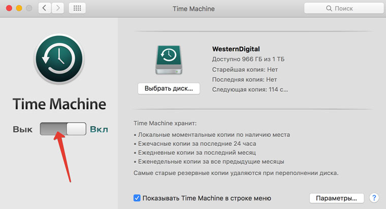 3. Убедитесь, что ползунок Time Machine находится в положение Вкл. Резервная копия начнет создаваться автоматически.
