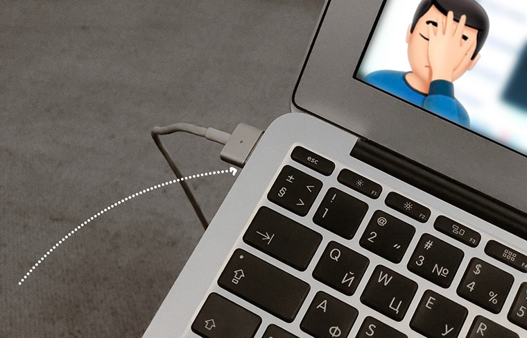 На этой картинке макбук как бы заряжается, но не заряжается. Потому что магнит отошёл – и всё, порт перестал работать.