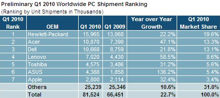 Apple стала единственным американским производителем компьютеров, показавшим рост продаж в первом квартале 2010 года, сообщило iSuppli. Mac поднимался на 32.4% год за годом и сейчас Apple имеет 3.4% всемирного компьютерного рынка или седьмое место в рейтинге. HP и Dell сделали больше, оказавшись на первом и третьем местах, однако развиваются они заметно медленней со средним показателем 22.7%.