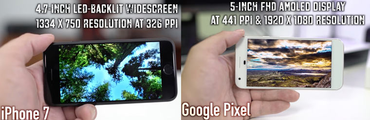 У 5-дюймового Google Pixel установлен 1080p экран с высокой плотностью на уровне 441 ppi. iPhone 7 довольствуется разрешением в 1334 х 750 и плотностью в 325 ppi.