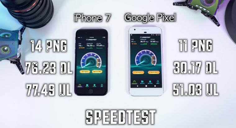 Скорость передачи данных по Wi-Fi сети у iPhone 7 в 1,5–2 раза выше максимальных показателей Google Pixel.