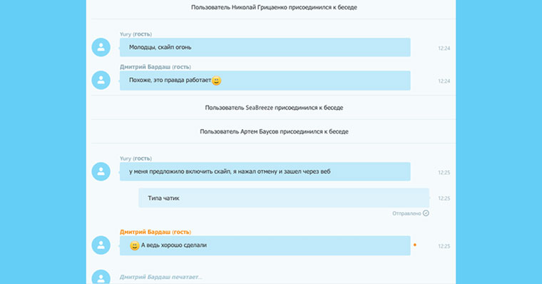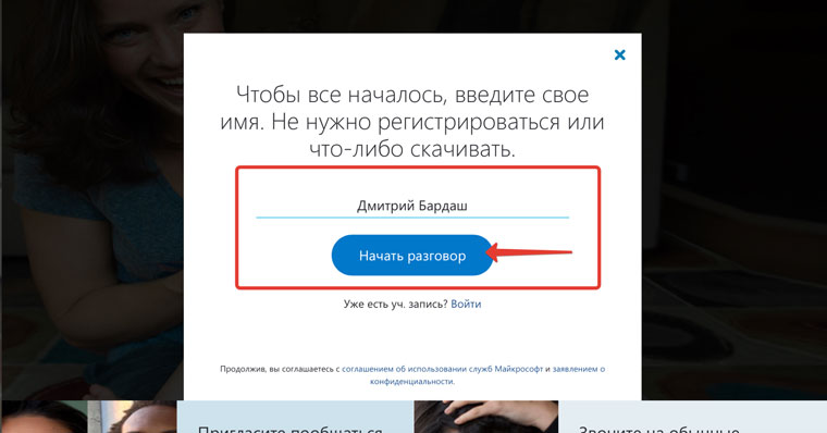 Получив ссылку, пользователю достаточно указать свои имя и приступить к переписке. Если Skype-клиент установлен на компьютере или смартфоне, после открытия ссылки запустится Skype-приложение, а диалог будет открыт непосредственно внутри приложения.