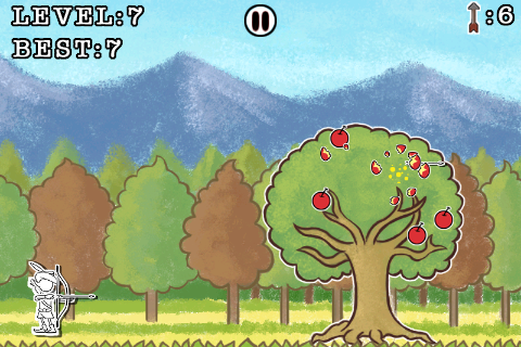 Режим второй, тактический. В нем мишенью по-прежнему выступают яблоки, однако теперь они находятся на дереве, а увеличение сложности происходит за счет роста числа яблок, при относительно небольшом количестве стрел.