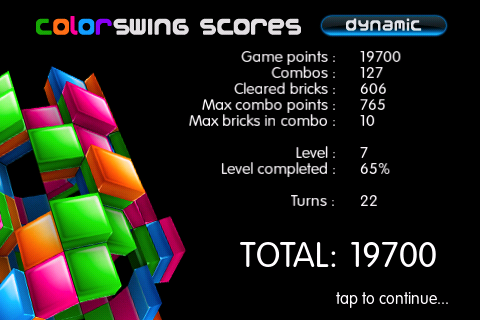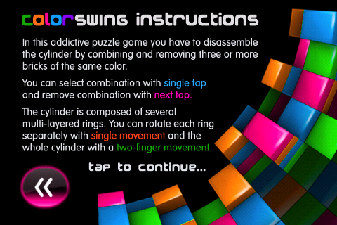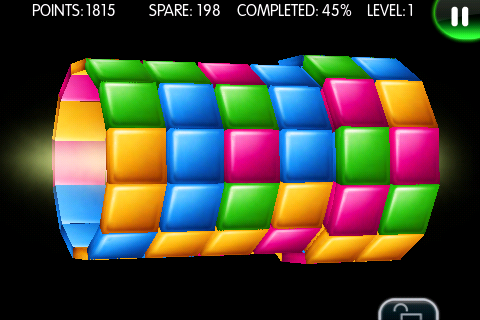 Во время игры перед вами будет находится внушительных размеров цветной цилиндр, который состоит из огромного количества полосок, которые в свою очередь делятся на квадраты. Ваша задача – соединить эти квадратики в одно цветное целое (минимум 3 фигуры одного цвета), передвигая полоски. Для передвижение последних понадобится только один палец и два для прокрутки всего цилиндра. После 15 минут игры с удивлением заметил, что она использует акселерометр iPhone – в зависимости от вашего положения разноцветная бочка будет поворачиваться разными концами.