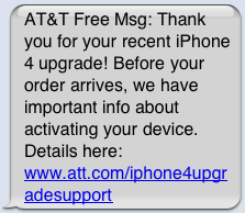 Один из лидирующих американских GSM-операторов AT&T снова вышел на контакт со своими клиентами. Вначале Apple напомнили, что было бы неплохо забрать свой новый iPhone 4 завтра, затем некоторых из них расстроил уже сам оператор, перенеся многие заказы на 29 число. Теперь всем, кому повезло пробиться через тонны ошибок сайтов и заказать новый смартфон от Apple, пришло SMS-сообщение: