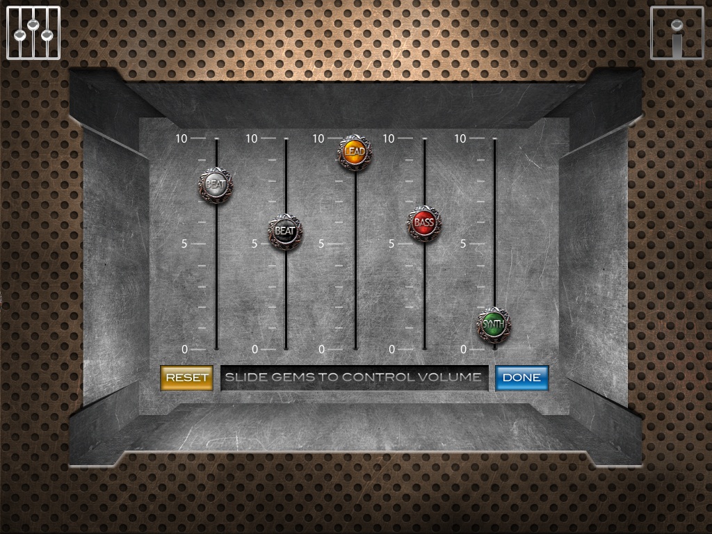 Кроме перечисленного, у нас появилось пять дополнительных точек размещения ползунков, что дает нам еще 25 звуков, если умножить на количество ползунков. Они есть только в iPad-версии, в чем, собственно, и заключается единственное отличие от телефонного варианта. В обоих вариантах есть регулятор громкости для каждого отдельного направления звуков. Единственным недостатком стало, пожалуй, то, что кнопка Reset, которая должна сбросить все громкости на стандартное значение, в HD-версии почему-то не работает, но это не слишком портит впечатление от программы.