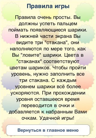 В роли целей выступают кружки разного цвета, которыми надо заполнить соответствующие сосуды. Скучать не придется, так как весь процесс ограничен по времени, а с каждым уровнем увеличивается сложность.