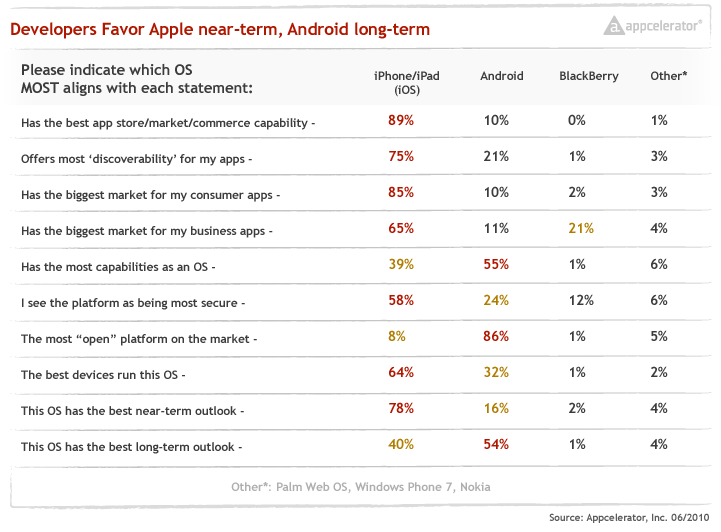 Appcelerator недавно провели опрос среди 2700 независимых разработчиков для того, чтобы выяснить их предпочтения относительно различных мобильных операционных систем. В отчете нет ничего такого, чего бы мы не знали ранее, но содержится одна важная мысль о том, в каком направлении развиваются мобильные технологии.