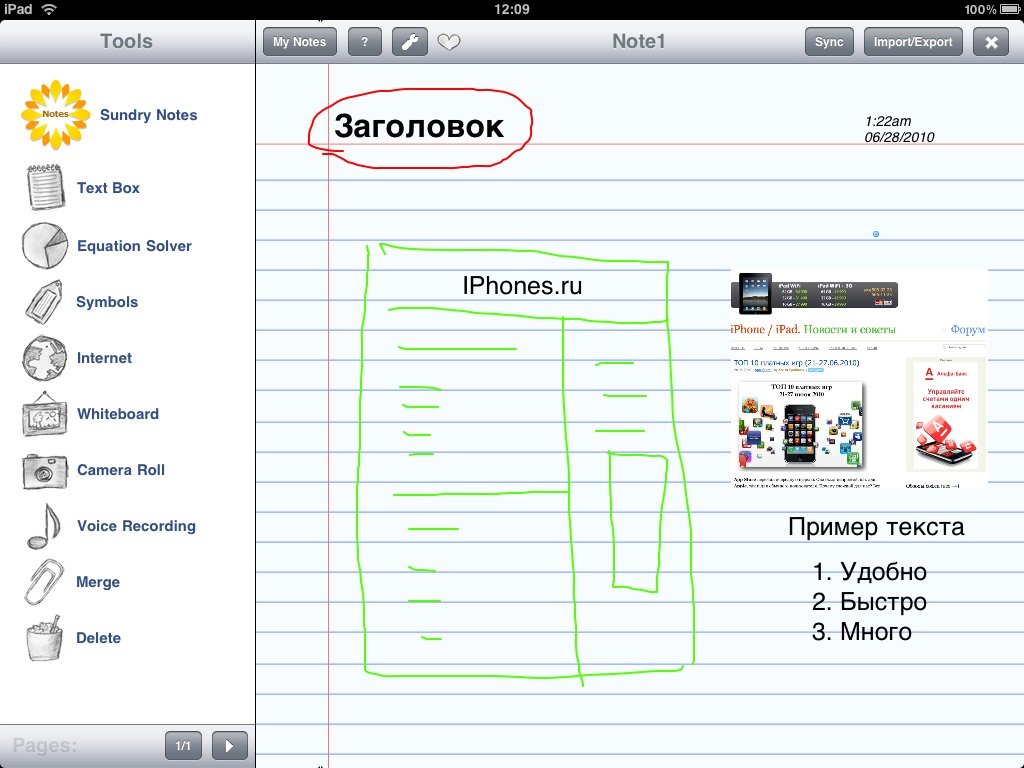Последнее время очень много информации об iPad связано с iBooks, борьбой с Amazon и вообще всякого рода выводом информации с “таблетки”. Но не стоит забывать, что, учитывая размер экрана iPad, он становится не только идеальной читалкой-смотрелкой, но и великолепной писалкой-хранилкой.