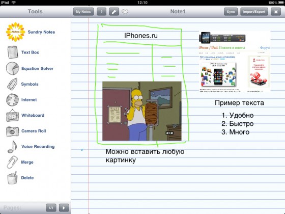 Для хранения и синхронизации заметок можно использовать аккаунты в Google Docs, Facebook и Twitter, а также есть возможность синхронизировать данные через iTunes. Любую заметку можно отправить в виде PDF по почте, как я уже говорил.