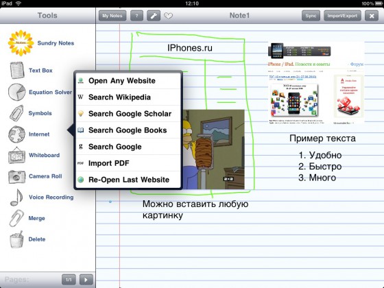 – Интернет. С помощью этой кнопки всегда можно получить доступ к браузеру или ключевым сайтам, вроде Wikipedia или Google. К сожалению, программа не понимает русских запросов через строку быстрого доступа, потому самым простым способом является вручную перейти на нужный сайт. Что нам это даст? Мы сможем добавить в заметку любой кусочек сайта, например, картинку с википедии или цитату в виде скриншота.