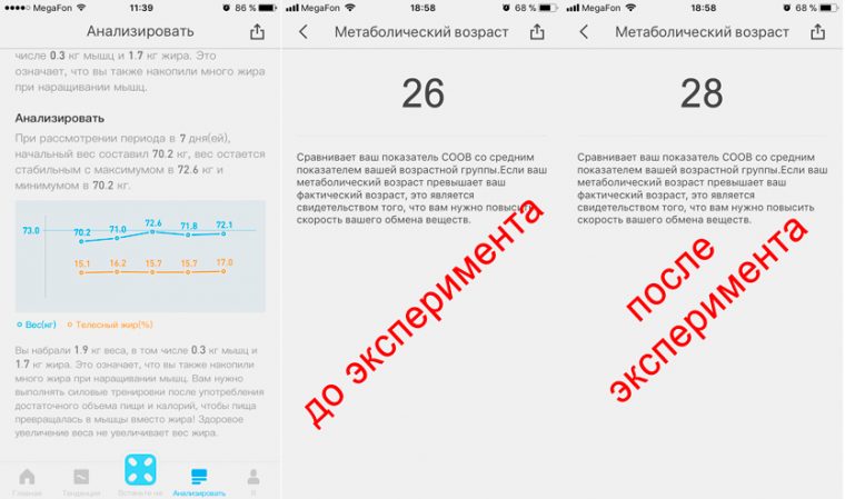 Но самое печальное в статистике — это было осознание того, что я прибавил … в возрасте. Мне 24 года. До начала эксперимента Picooc S3 Lite оценили мой метаболический возраст на 26 лет. Нагружая организм колой, всего за 7 дней я ухудшил свое состояние обмена веществ на два года. Так-то!